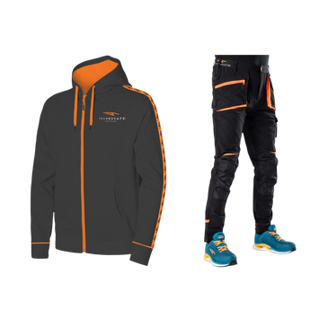 Il completo da lavoro Dark Mode è la scelta ideale per chi desidera unire eleganza sobria e funzionalità tecnica. Con la sua combinazione di felpa nera e pantaloni neri rinforzati, offre una linea pulita e professionale senza rinunciare al comfort e alla resistenza che servono nelle giornate di lavoro più intense.